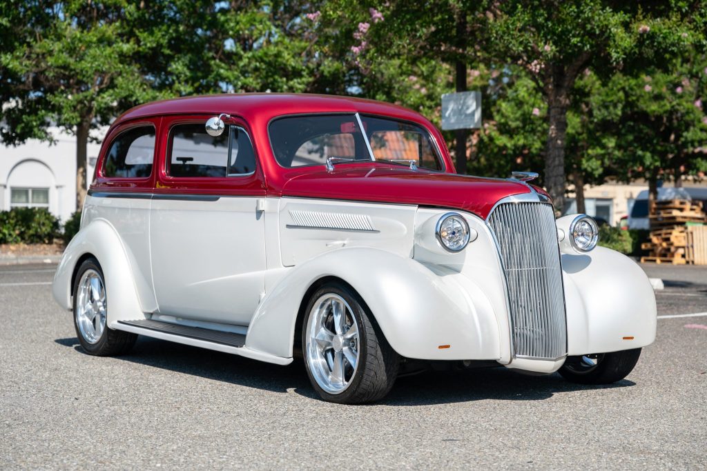 This 1937 Chevrolet Sedan street rod was refurbished and modified under previous ownership and is powered by a 383ci Chevrolet V8 equipped with an Edelbrock four-barrel carburetor, an electronic ignition, and a 3″ dual exhaust system with ceramic-coated headers. The car is finished in red and white and is also equipped with a four-speed automatic transmission, independent front suspension, rack-and-pinion steering, four-wheel disc brakes, 17″ Foose wheels, and a 10-bolt rear end. The interior is upholstered in red,…