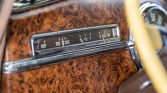 The cabin features front and rear bench seats trimmed in striped gray cloth along with a color-coordinated headliner, door panels, and carpets. Woodgrain trim accents the door caps, and equipment includes an AM radio, a heater, a clock, and a locking glovebox, while the rear cabin features a robe cord, a footrest, and a fold-down armrest.