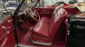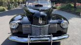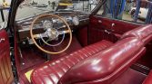 This 1941 Cadillac Series 62 convertible is finished in black over red and powered by a 346ci L-head V8 paired with a four-speed Hydra-Matic automatic transmission. Features include a tan convertible top, red-painted 15″ wheels with chrome hub caps, whitewall tires, chrome bumpers with overriders, and a split front windshield.
