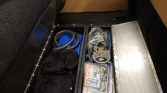 The cabin features tan leather seats along with matching door panels and black carpets and floormats. Amenities include push-button start, three-point seat belts, a glove compartment, storage pockets in the doors, a passenger grab bar, and a dash-mounted rearview mirror. A “smuggler’s box” has been built into the floor behind the seats, and can be used for additional storage.