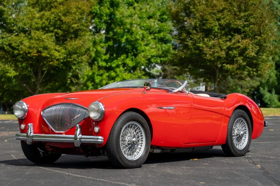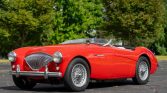 This 1955 Austin-Healey 100 BN1 roadster was built in June 1955 and delivered to the United States, and an owner who reportedly acquired the car in 1966 had the vehicle refurbished in British Columbia, Canada, from 2003 through 2010. Powered by a 2.7-liter inline-four paired with a three-speed manual transmission with overdrive, the car is finished in red over beige upholstery with red piping. Features include dual SU carburetors, 15″ knock-off wire wheels, a removable black soft top,…