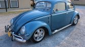 This 1956 Volkswagen Beetle is finished in Eismeer Blue Metallic over a two-tone gray interior and powered by a 2,387cc flat-four paired with a four-speed manual transmission. The car was acquired by the seller in 2007 and subsequently refurbished with work including a body-off repaint, refreshing the interior, and installation of a custom sound system with a Pioneer Bluetooth stereo, Porsche-style Fuchs wheels, a Porsche fan conversion, four-wheel disc brakes, a dual-outlet exhaust, and ISP instrumentation. Equipment…