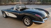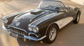 This 1959 Chevrolet Corvette was refurbished and modified during prior ownership, with work including refinishing the exterior in black with white coves as well as installation of a fuel-injected 5.7-liter L98 V8 and a six-speed manual transmission. Equipment includes power steering, a dual exhaust system, staggered-width 15″ American racing wheels, updated suspension components, and four-wheel disc brakes.