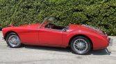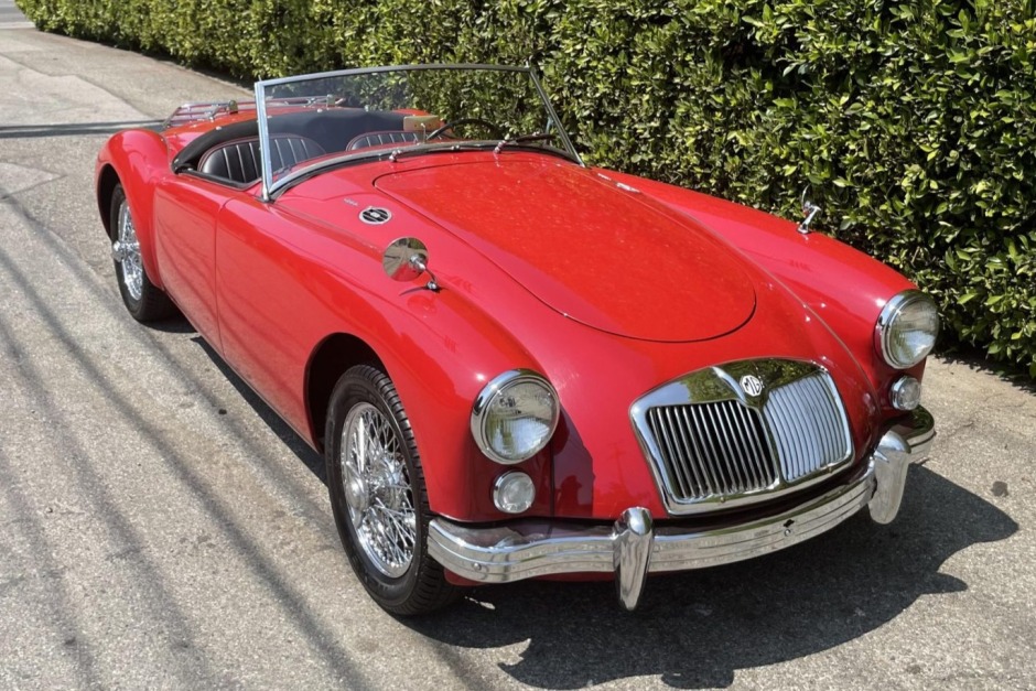 This 1960 MG MGA 1600 Roadster is finished in red over black vinyl upholstery and is powered by a 1.6-liter inline-four paired with a four-speed manual transmission. Features include a black soft top, a chrome luggage rack, 15″ chrome-finished wire wheels, fender-mounted side-view mirrors, and an oversized aftermarket radiator. The car is said to have been refurbished during previous ownership and was acquired in June 2019 by the seller. Work has since included installing a battery cut-off…