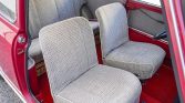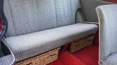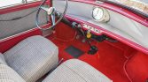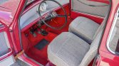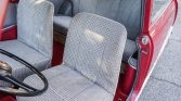 The left-hand-drive cabin features patterned cloth upholstery on the seats, which were rebuilt with replacement foam, and the seller installed matching upholstery on the door panels. The floors are protected by red carpets that were installed under current ownership. The heater was rebuilt, and a period-style rear-view mirror was also installed. Wicker storage baskets are housed beneath the rear seats.