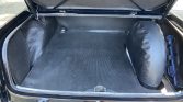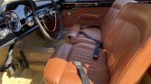 The seats and door panels are upholstered in brown leather, and the floors are lined with off-white carpeting. Features include a Becker Europa II AM/FM push-button radio, a lockable glovebox, and lap belts for the front-seat occupants.