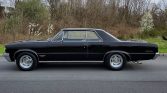 The car was refinished in black during previous ownership. Chrome bumpers, wheel-arch trim, and rocker-panel moldings complement a pair of nonfunctional hood scoops and quad chrome exhaust tips exiting in pairs on either side of the car just behind the rear wheels.