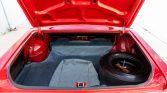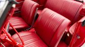 The cabin features front bucket seats and a rear bench that have been reupholstered in red vinyl and are accented by coordinating door panels and replacement red carpeting. Appointments include lap belts, patterned-metal dash trim, a heater, and a locking glovebox.