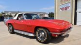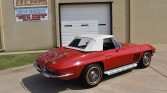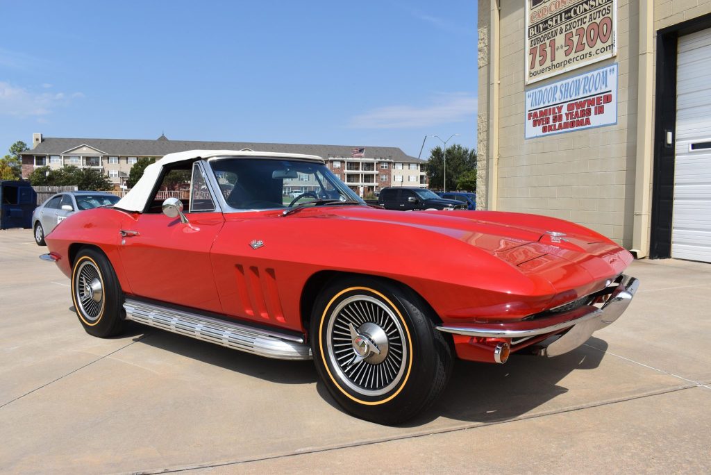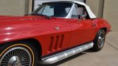 This 1966 Chevrolet Corvette convertible is powered by a 327ci V8 paired with a four-speed manual transmission and is finished in red over black vinyl. The car was refurbished circa 2014. Work in preparation for the sale involved replacing the coolant expansion tank, voltage regulator, right rear brake caliper, and hardware for the body-color removable hardtop. Equipment includes a white soft top, turbine-style wheels, four-wheel disc brakes, a rear luggage rack, a side-exit exhaust system, and a push-button…