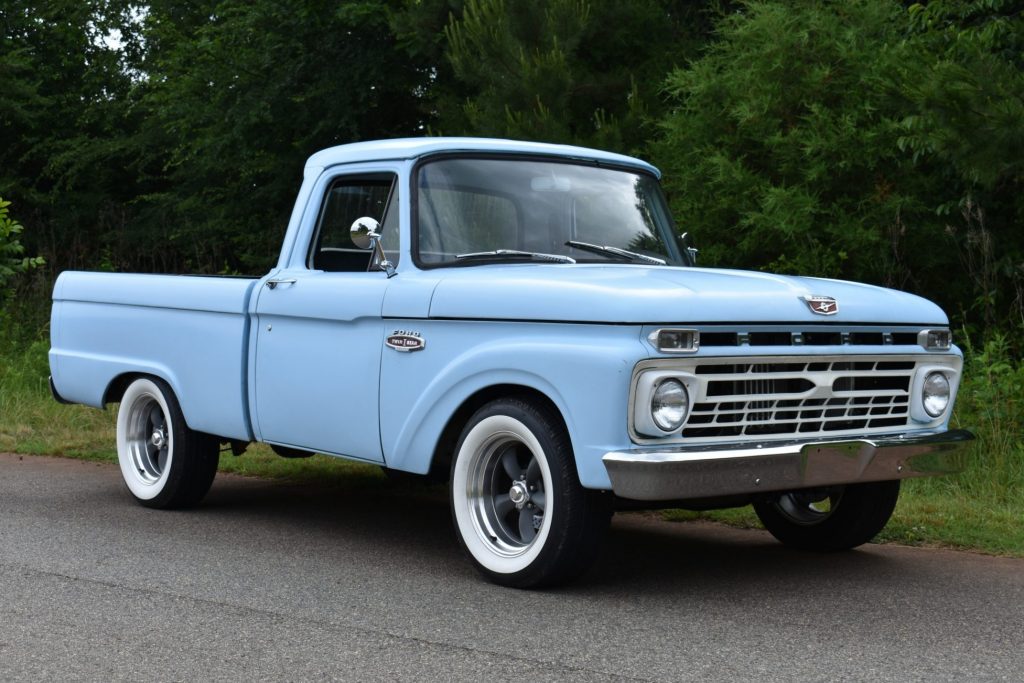 This 1966 Ford F-100 was acquired by the current owner in 2018 and subsequently fitted with a 351ci Windsor V8 paired with a TCI Stage 2 three-speed automatic transmission. The truck is finished in satin light blue over blue upholstery, and equipment includes 17″ American Racing wheels with Diamond Back Classics whitewall tires, Master Power four-wheel disc brakes, a FiTech fuel injection system, an Edelbrock intake manifold, a Champion aluminum radiator with dual electric fans, Sanderson headers, an MSD electronic ignition system, and three-point seat belts. Front and rear swaybars have been added and the shocks and fuel tank have been replaced.