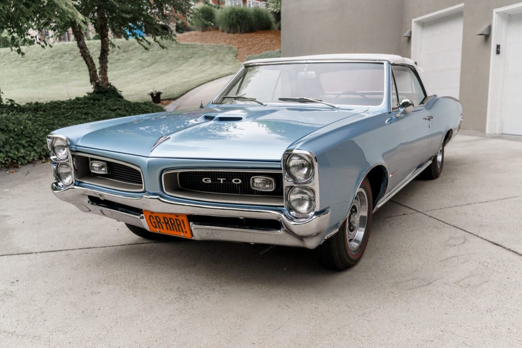This 1966 Pontiac GTO convertible was purchased by the seller’s father in 1982 and given to the seller as a graduation gift around 1986. A body-off refurbishment was carried out between 2011 and 2012, with work including a bare-metal repaint in blue, reupholstered white vinyl seats, and the installation of a Muncie four-speed manual transmission. The 389ci V8 was also rebuilt and fitted with three two-barrel carburetors at that time, and additional equipment includes a white soft top, air conditioning, a push-button radio, a dual exhaust system, and power steering and brakes.
