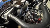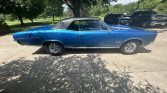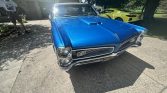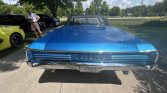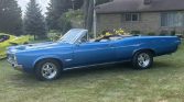 This 1966 Pontiac LeMans convertible was refurbished in 2003 and is powered by a 400 paired with a three-speed automatic transmission and is refinished in blue over a reupholstered black interior. Equipment includes a power-operated black soft top, power-assisted front disc brakes, power steering, rear air shocks, 15″ Cragar S/S wheels, an aftermarket AM/FM radio, a wood-rimmed steering wheel, and a custom oak center console.