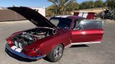 Originally finished in Acapulco Blue (D5), the car was refinished in burgundy with white stripes in the early 2000s following the addition of Shelby-style front and rear fascias, a fiberglass hood with an integrated scoop and hold down pins, side air intakes, and a custom fiberglass decklid and rear spoiler. The trunk floor was replaced in 2018. Additional equipment includes Shelby badges and side stripes, grille-mounted driving lights, LED taillights, and red underside lights.