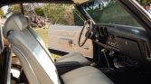 The cabin features bucket seats trimmed in Parchment vinyl along with matching door panels and a black dashboard and carpets. Amenities include a center console, a push-button AM/FM stereo with an eight-track player, electric windows, and power-assisted steering.