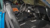 The cockpit is equipped with high-back bucket seats and a rear bench upholstered in black vinyl and joined by matching carpets with rubber inserts in the footwells covers the floors. Equipment includes air conditioning, cruise control, a Hurst shifter, and intermittent windshield wipers.