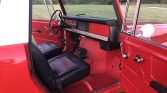White-finished 15″ wagon wheels are mounted with 31×10.5″ BFGoodrich All-Terrain tires, and a matching full-size spare is mounted at the rear. The truck is equipped with manually locking front hubs, and stopping power is provided by drum brakes at all four corners.