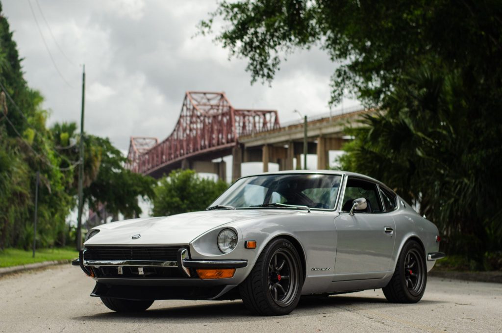 This 1971 Datsun 240Z is finished in silver over black upholstery and powered by a 2.4-liter inline-six mated to a replacement five-speed manual transmission. Modifications includes a Nardi steering wheel and shift knob, 16″ RS Watanabe wheels, Tokico shocks, Eibach springs, a BRE-style front lip spoiler, aftermarket exhaust components, an aluminum radiator, four-piston calipers, and a limited-slip differential. The car was recently acquired by the seller, and subsequent service included an oil change and bleeding the brakes and clutch.
