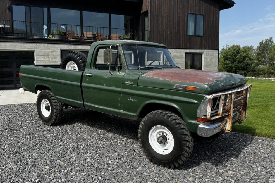 The power on this 1971 Ford F-250 Custom 4×4 pickup is provided by a 390ci V8 linked with a four-speed manual transmission and a dual-range transfer case and the truck is finished in green over green vinyl upholstery. Features include a rear step bumper, front tow hooks, a white brush guard, an Edelbrock 600-cfm carburetor, stainless-steel exhaust headers, electronic ignition, manually locking front hubs, white 16″ steel wheels, and Old Man Emu shocks. The cabin is outfitted with an AM radio, Bass 48 overhead speakers, and a heater.