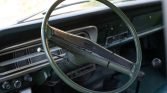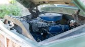 The bench seat is trimmed in green vinyl upholstery along with color-matched door panels and carpeting. Equipment includes a white headliner, an under-dash AM radio, Bass 48 overhead speakers, a heater, lap belts, and crank windows.
