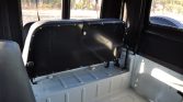The interior features front bucket seats and inward-facing rear jump seats that have been reupholstered in black vinyl. The floors are protected by black covers, and equipment includes a glovebox and manual wind-up windows. Cabin switchgear has been labeled.