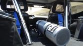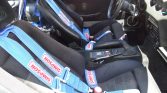 The cabin is upholstered in black and is equipped with Recaro bucket seats and Simpson racing harnesses. Features include a B&M shifter, a chrome roll bar, a wide-angle rearview mirror, and an aftermarket stereo system. A nitrous oxide bottle is mounted in the rear cargo area, and the controls for the system are housed in the glovebox.