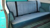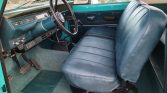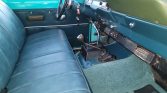 The interior features blue vinyl seats along with a matching dashboard, door panels, and carpets. An aftermarket radio is fitted, and while air-conditioning vents and controls are present, the compressor has been removed.