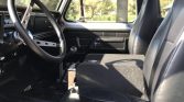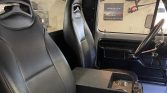 The standard cab features reclining Corbeau high back bucket seats upholstered in black. Equipment includes a black aftermarket center console with cup holders, LED lighting, a Cobra CB radio, a replacement black and tan dashboard, a JVC stereo, a 10-inch subwoofer, a replacement floor liner with insulation, aftermarket power door locks, and manual windows.