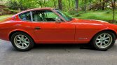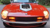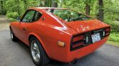 The car was repainted during prior ownership and is finished in orange with a black, blue, and white stripe on the center of the hood, along with a painted white roof panel. The rear bumper has been removed, while additional features include a chrome front bumper, US-spec side markers and mirrors, Fairlady Z badging, and a single exhaust outlet.