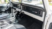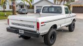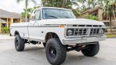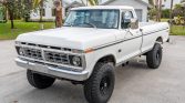 This 1975 Ford F-250 Ranger XLT 4×4 is powered by a 360ci V8 linked with a three-speed automatic transmission and a dual-range transfer case, the truck has been repainted in white. Additional work carried out under previous ownership included refreshing the exterior and interior components, adding electrically assisted power steering, replacing brake components, and installing a Painless Performance wiring kit, Vintage Air air conditioning, and an aluminum radiator. The truck is further equipped with a chrome front bumper, a bedside storage box, a receiver hitch, a black-finished rear bumper, a lifted suspension, manually locking front hubs, 16″ American Racing Outlaw II wheels, a Sony CD stereo, an Apple CarPlay display, and an aftermarket rearview mirror with an integrated reversing camera display.