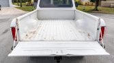 The truck was repainted in white with black accents and received a replacement windshield, rear window, LED headlights, taillight lenses, and rubber seals under current ownership. Exterior details include a chrome front bumper, a bedside storage box, a receiver hitch, a black-finished rear bumper, and dual mirrors.