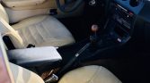 The seating surfaces are upholstered in cream vinyl with matching door panels complemented by a black dashboard, center console, and carpets. Amenities include air conditioning, a wood shift knob, and an armrest.