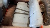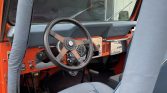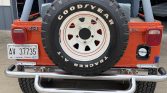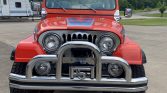 This 1979 Jeep CJ-5 is finished in orange with blue Renegade graphics over blue vinyl upholstery and is powered by a 304ci V8 paired with a three-speed manual transmission and a dual-range transfer case. Equipment includes a suspension lift, aftermarket chrome bumpers, a Warn winch, and a roll cage. The seller acquired the truck in 2019, and an oil change was completed in preparation for the sale.
