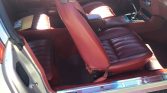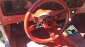 The interior features Carmine vinyl seating surfaces along with a matching dashboard, door panels, and carpets. The steering wheel was reportedly sourced from a Trans Am, and additional equipment includes woodgrain trim, front bucket seats, front shoulder harness seat belts, and an AM/cassette stereo.