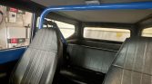 The cabin features front bucket seats with integrated headrests and a rear bench seat that were reupholstered in black vinyl along with matching replacement door panels and carpet. Features include LED interior lights, a center console, sliding rear windows, a heater, and a Kenwood CD stereo with Bluetooth connectivity along with Kenwood speakers.