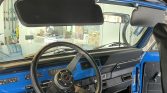 A three-spoke steering wheel frames an instrument panel finished in Blockbuster Blue to match the exterior and fitted with a 115-mph speedometer along with auxiliary instrumentation. The five-digit odometer indicates 61k miles.