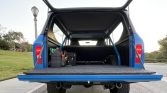 The exterior was reportedly taken down to bare metal and resprayed in Blockbuster Blue with gloss black side stripes in 2019 following replacement of the inner and outer rear fenders along with the floor pans. The removable hardtop was also refinished in gloss black with a gray felt headliner. Features include a roof rack, aftermarket steel bumpers with shackles, a 2” receiver hitch, LED exterior lighting, and a black-finished grille with round LED headlights.