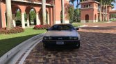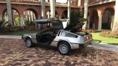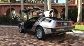 The cabin features black leather upholstery with a matching dashboard, center console, and door panels along with gray carpets. Equipment includes air conditioning, a cassette stereo, power windows, and DMC-branded floor mats. Modifications include a stainless-steel shifter plate and sill plate letters, Sony speakers, a Lockzilla keyless entry system, an Alcantara headliner, and a spare storage compartment door with a “flux capacitor”-style face.