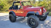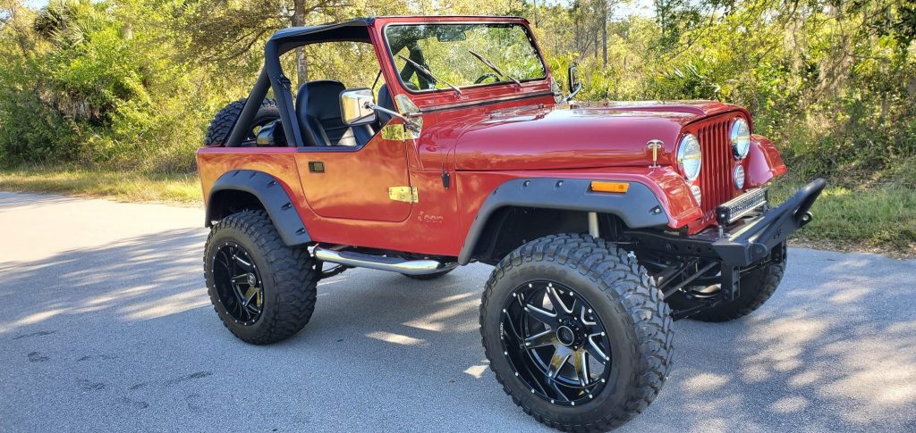 This 1982 Jeep CJ-7 was acquired by the seller in 2015 and subsequently refurbished with work including a repaint, replacement of interior and exterior components, and installation of a 302ci Ford V8 linked with a four-speed automatic transmission and a dual-range transfer case. The truck is finished in red over a black vinyl interior, and equipment includes a locking center console, a JVC head unit, an LED light bar, a 3″ suspension lift, a swingout rear tire carrier,…
