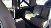 The cabin houses Bestop Trailmax front bucket and rear bench seats upholstered in tan with matching door panels and a center console. Equipment includes a roll bar with padding, on-board power tank, fire extinguisher, a passenger-side grab bar, Panasonic stereo, and a Tuffy locking cargo box. The truck is reportedly pre-wired for a CB radio.