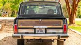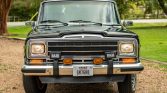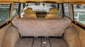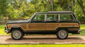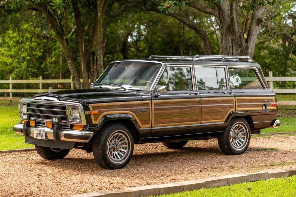 The truck is finished in black with faux woodgrain paneling over tan leather upholstery and is powered by a 5.9-liter V8 paired with a three-speed automatic transmission. Equipment includes Selec-Trac four-wheel drive, 15” alloy wheels, a chrome roof rack, fog lights, cruise control, air conditioning, and a factory AM/FM cassette stereo.