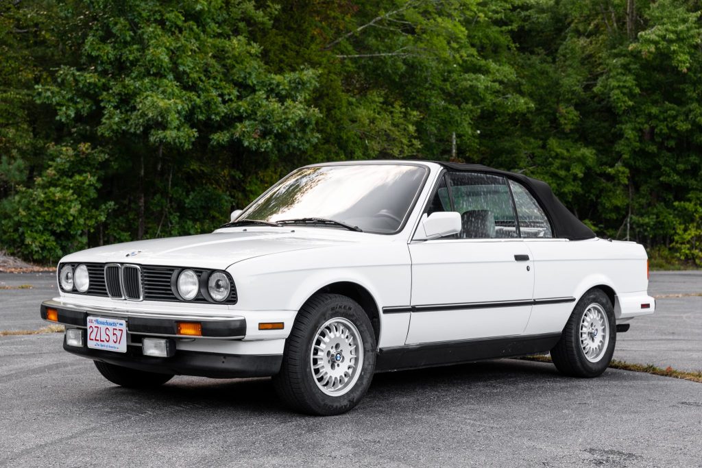 This 1989 BMW 325i convertible is finished in white over beige leather and is powered by a 2.5-liter inline-six paired with a four-speed automatic transmission. Equipment includes a black convertible soft top, 14″ wheels, heated front seats, cruise control, and an aftermarket stereo. The car spent its life in Hawaii until 2004, and it resided in several other states until it was acquired by the seller and relocated to Massachusetts in August 2021. Subsequent service is reported to have included replacement of the carpets, tires, and spark plugs.