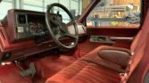 This 1990 Chevrolet C1500 Silverado is a regular-cab stepside pickup that is finished in red over matching cloth and powered by a 5.7-liter V8 paired with a four-speed automatic transmission. Equipment include 20″ aftermarket wheels, lowered suspension, bed rails, a drop-in bed liner, a Dynomax exhaust muffler with twin outlets, air conditioning, and a Delco cassette stereo.