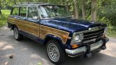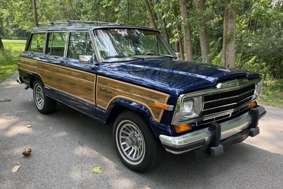 This 1991 Jeep Grand Wagoneer Final Edition is finished in blue over a beige interior and is powered by a 5.9-liter V8 paired with a three-speed automatic transmission and a dual-range transfer case. Equipment includes the Selec-Trac four-wheel drive system, alloy wheels, a sunroof, power-adjustable front seats, an overhead console, and a JVC CD stereo.