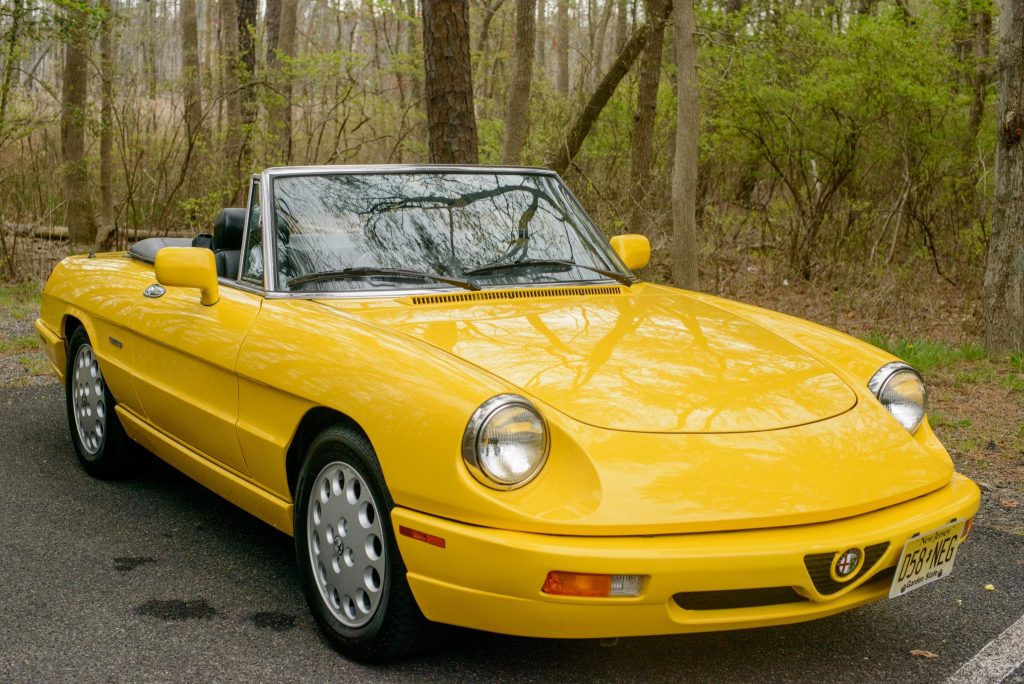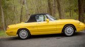This 1992 Alfa Romeo Spider Veloce is finished in yellow over black leather and powered by a 2.0-liter inline-four paired with a five-speed manual transmission. Equipment includes a black soft top, a Sony cassette stereo, air conditioning, 15″ light alloy wheels, power windows, and body-colored mirror caps and bumpers. The car was first delivered to Springfield Imported Motors in New Jersey, and it remained in the state through its acquisition by the seller in March 2021. It now shows 20k miles, and recent service included an oil change and replacement of the spark plugs and clutch cylinders.