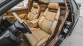 The cockpit features tan leather upholstery on the seats and armrests as well as a matching dashboard, carpets, and floor mats. Other equipment includes a power-adjustable driver seat, automatic climate control, cruise control, and an aftermarket Pioneer infotainment screen paired with a Bose audio system. Carbon-look center console trim has been added along with a short-throw shifter kit, and an HKS boost controller has been fitted in the glovebox.