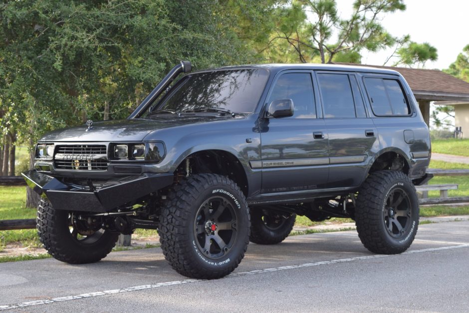 This 1993 Toyota Land Cruiser FZJ80 was refurbished in Colombia prior to its importation to the US in August 2019. The work included a repaint and reupholstery of the interior in leather as well as installation of Fox shocks, a snorkel, a 3″ stainless-steel exhaust system, custom bumpers, and LED lights. Power is from a 4.5-liter 1FZ-FE inline-six that is said to have rebuilt using performance pistons, Ferrea valves and springs, and a Crower cam kit. The truck is…