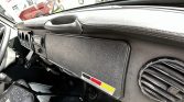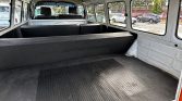 The front cabin houses a split bench seat trimmed in black vinyl with patterned inserts. Interior elements include an aftermarket shifter, a 12-volt charging outlet, and an aftermarket head unit linked to speakers in the rear cargo area and front kick panel.