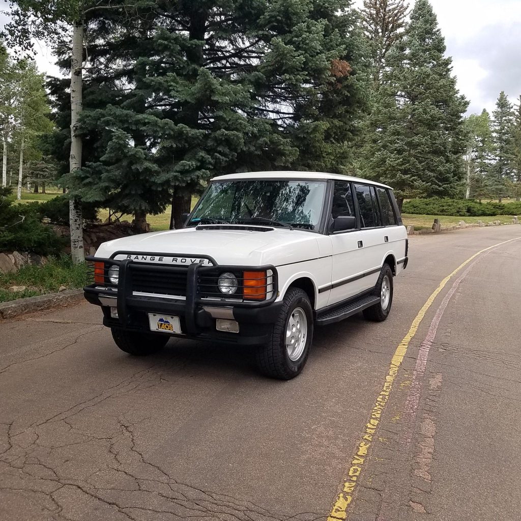 The truck is finished in white and features a sunroof, a front brush guard, a rear window wiper, running boards, fog lights, and taillamp guards. Dents in the driver’s door are noted, the Range Rover decals have been replaced, and the front brush guard was reportedly refinished in preparation for the sale.