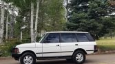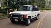 This 1995 Land Rover Range Rover Classic County is a long-wheelbase example that is finished in white over tan leather. The truck is powered by a 4.2-liter V8 linked with a four-speed automatic transmission and a dual-range transfer case. Features include a front brush guard, a sunroof, dual-zone climate control, power-adjustable heated front seats, fog lights, and 16″ alloy wheels. The seller acquired the truck in 2006, and maintenance performed in 2021 included installation of a replacement catalytic converter, alternator, battery, fuel injector O-rings, as well as fluid changes.
