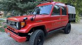 This 1995 Toyota Land Cruiser HZJ75 is a right-hand-drive example that was outfitted for fire service in Japan before it was imported to the US in 2021 and further modified. Finished in red over gray vinyl, the truck has a bed with removable side panels and a tan soft top along with a roof rack, a two-inch suspension lift kit, power steering, and 16″ steel wheels. Power is provided by a 4.2-liter 1HZ diesel inline-six fitted with a…